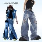 Button Detail Straight-Leg Ripped Wide-Leg Pants
