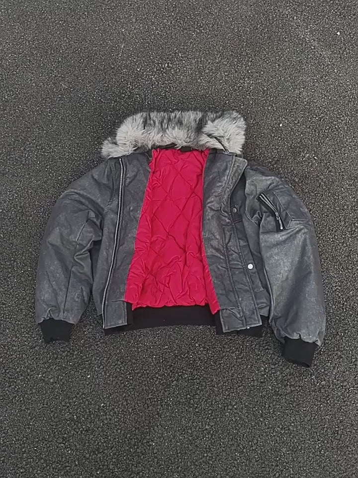 Dark Washed Fur-Collar Quilted Winter Jacket