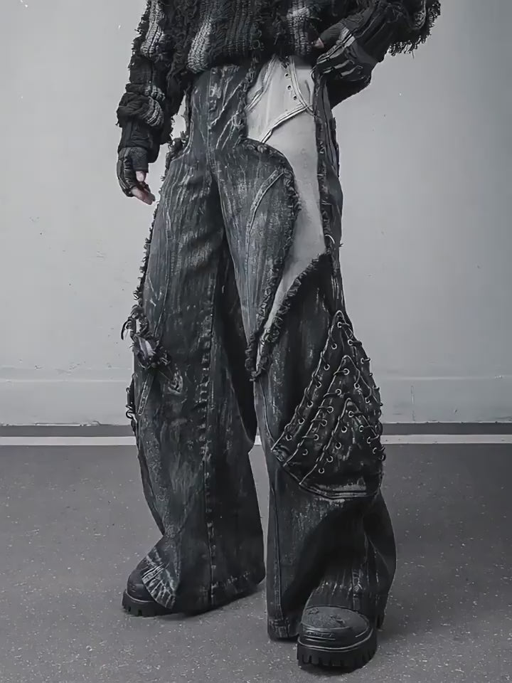 Heavy Washed Patchwork Distressed Deconstructed Wide-Leg Denim Pants
