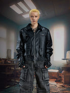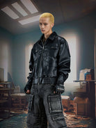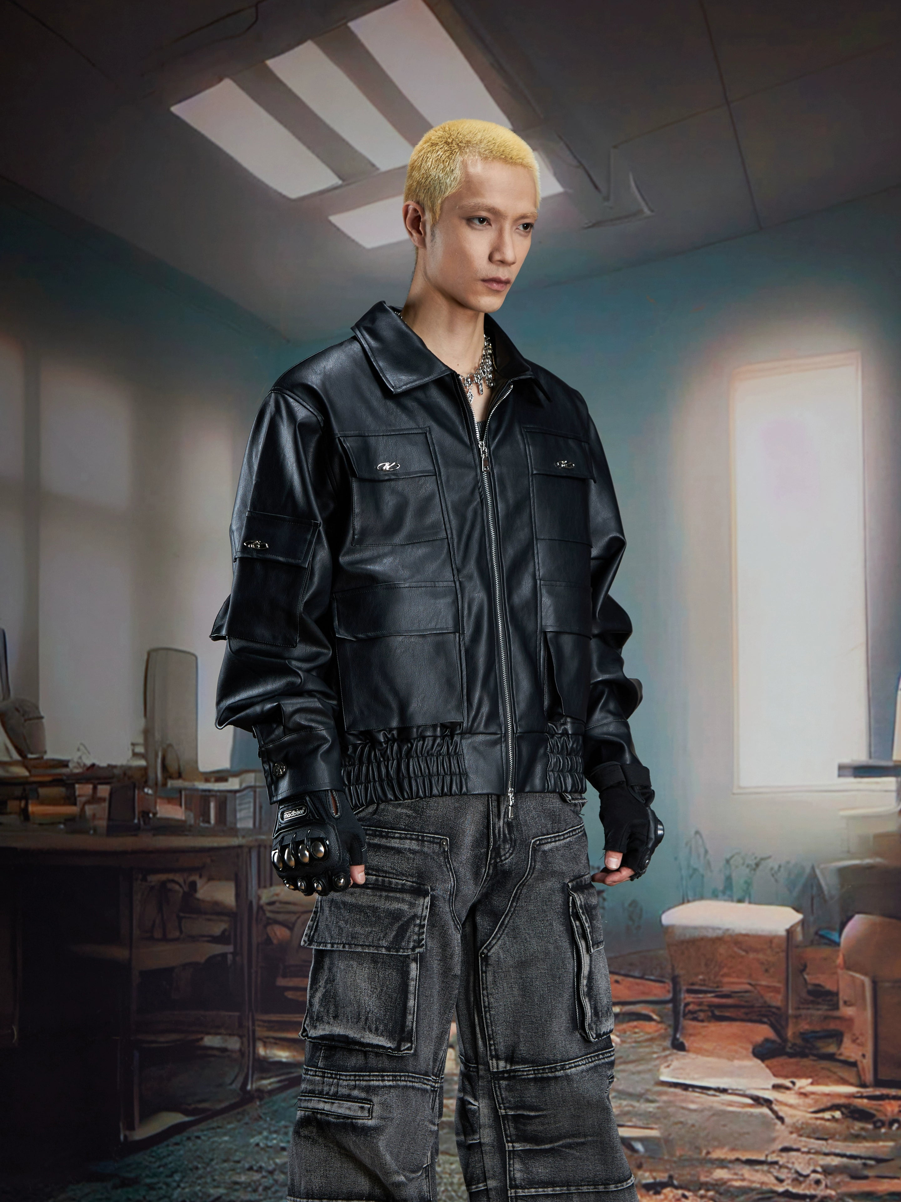 Metal-Detail Short Leather Jacket with Multi-Pocket Design