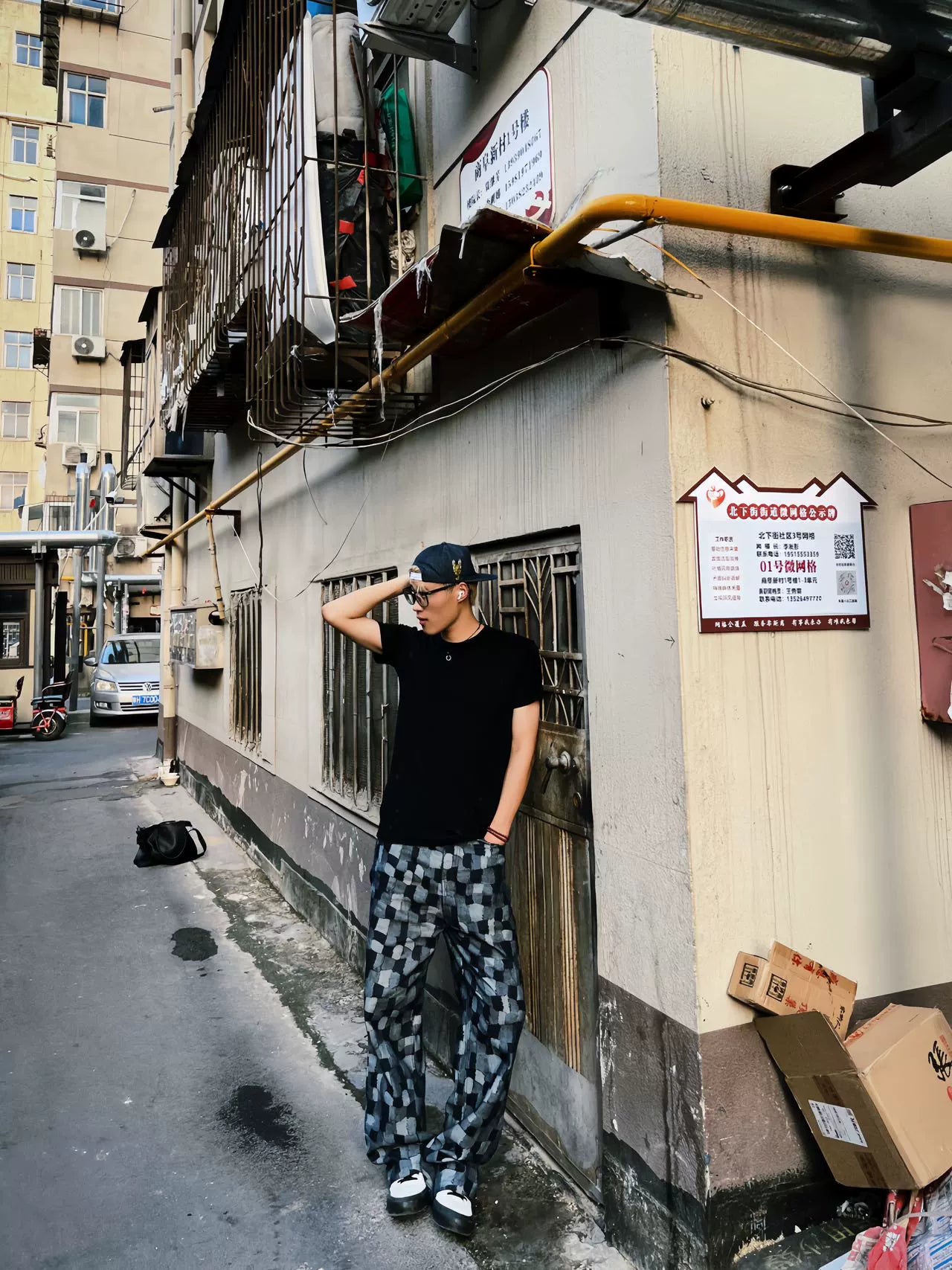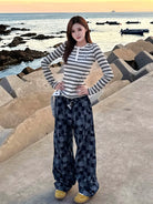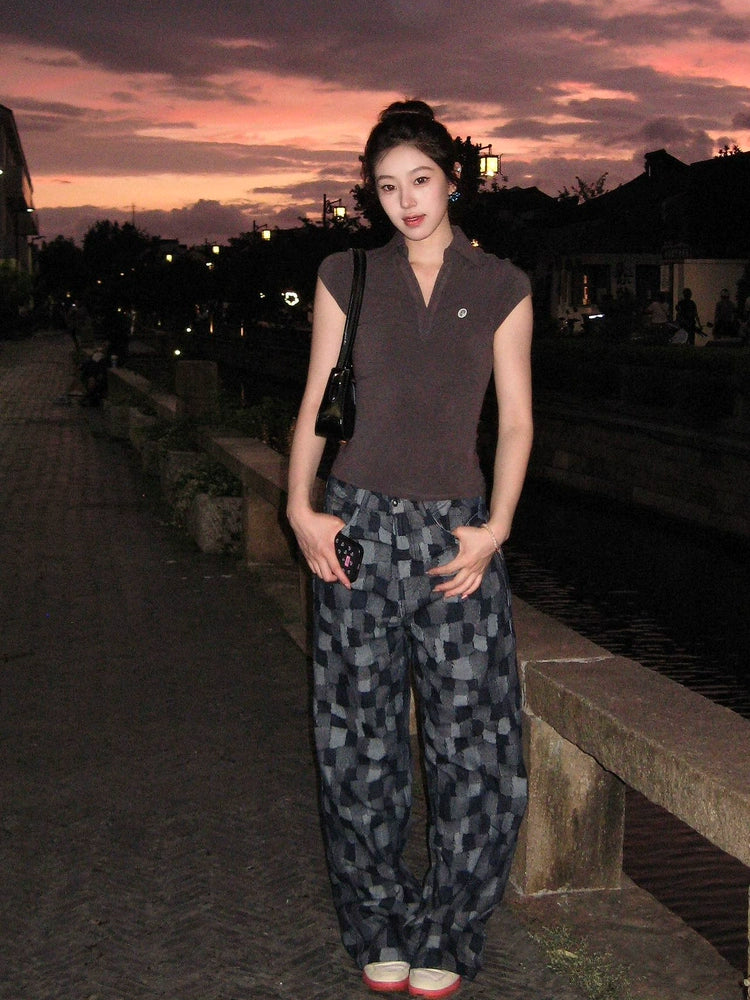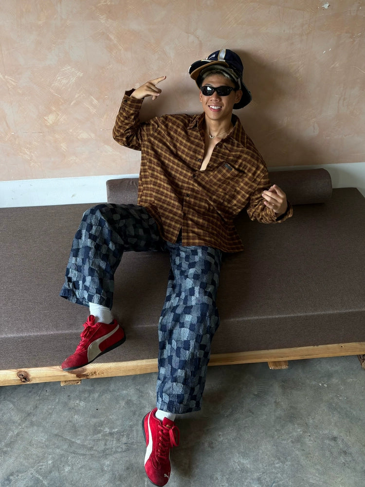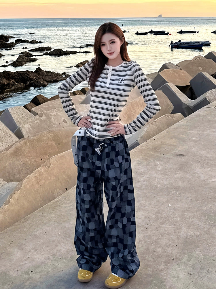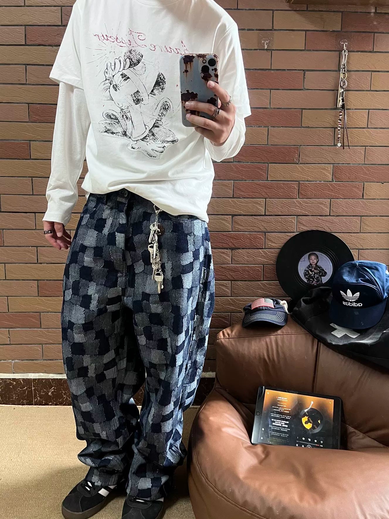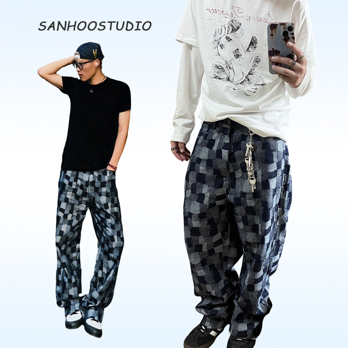 【25s Sep.】Plaid Patchwork Washed Straight Denim Pants