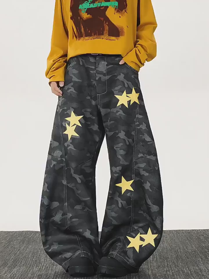 Star Appliqué Embroidered Camo Wide-Leg Pants