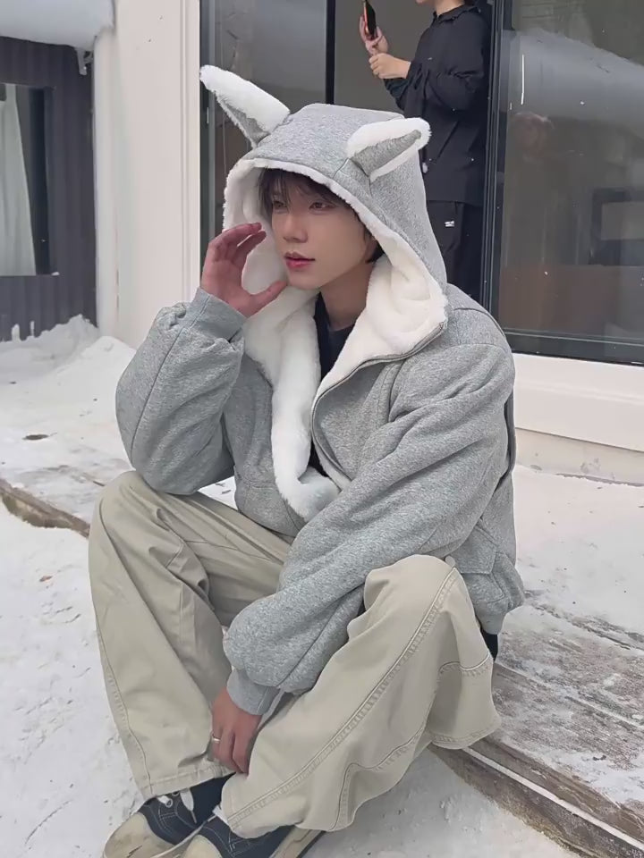 Vintage Bunny-Ear Hooded Sweatshirt Puffer Jacket
